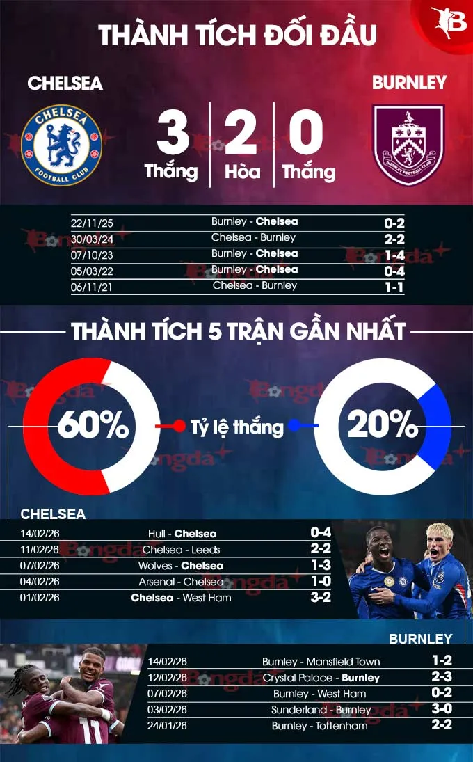 Lịch sử đối đầu càng làm rõ thế trận. Chelsea đã bất bại trong 12 lần gặp Burnley gần nhất, với thành tích 9 thắng và 3 hòa. Áp lực dường như đổ dồn hoàn toàn về phía đội khách.