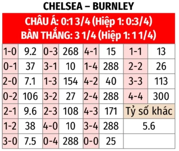 Với thế trận áp đảo, phong độ cao và động lực lớn, Chelsea được kỳ vọng sẽ có chiến thắng đậm trước một Burnley đang sa sút. Hiệp 1 dự báo sẽ diễn ra chặt chẽ với ít cơ hội và phạt góc.