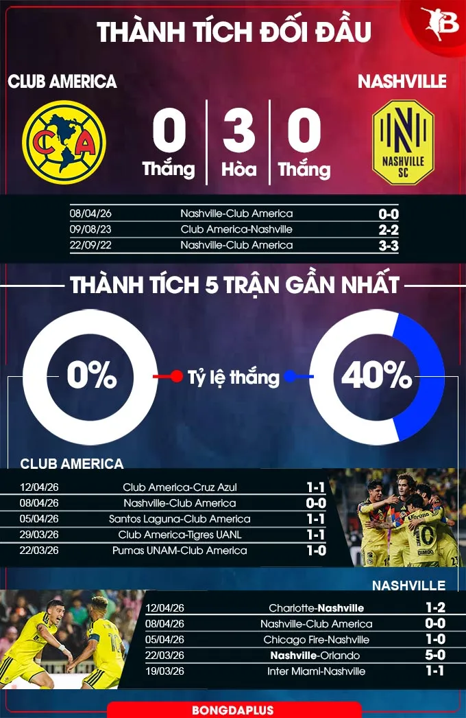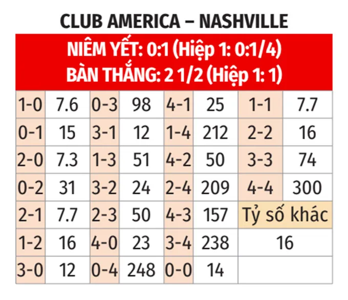 - Trận đấu ít bàn: Cả 7 trận gần nhất của Club America và 5/6 trận vừa qua của Nashville đều chứng kiến tối đa 2 bàn thắng được ghi.